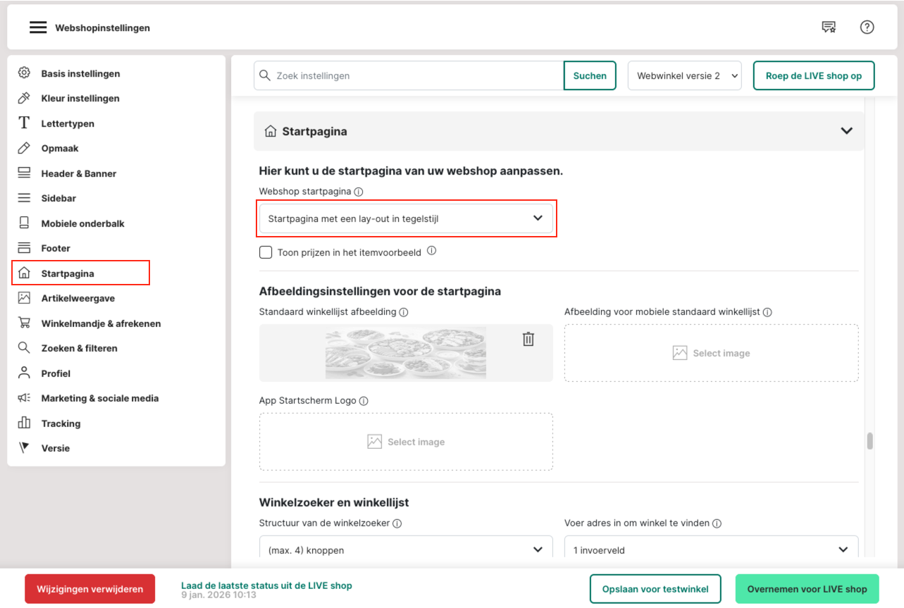 - De geactiveerde optie "Startpagina met een lay-out in tegelstijl" in de webshopinstellingen (onder Admin: Webshop & App > Webshopinstellingen > Webshop versie 2 > Startpagina > Startpagina met een lay-out in tegelstijl).