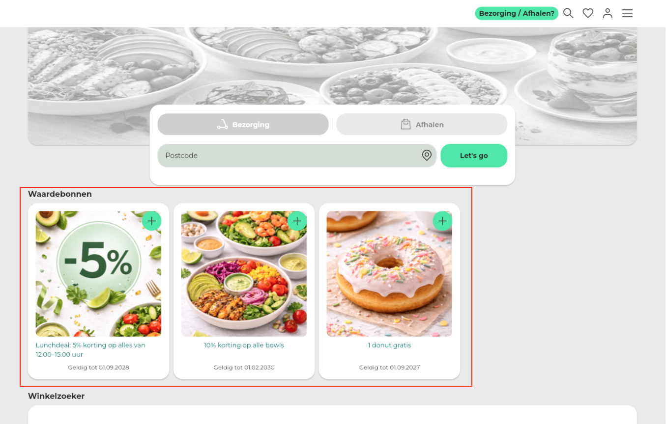 - Hoge zichtbaarheid van waardebonnen direct bij het openen van de webshop.