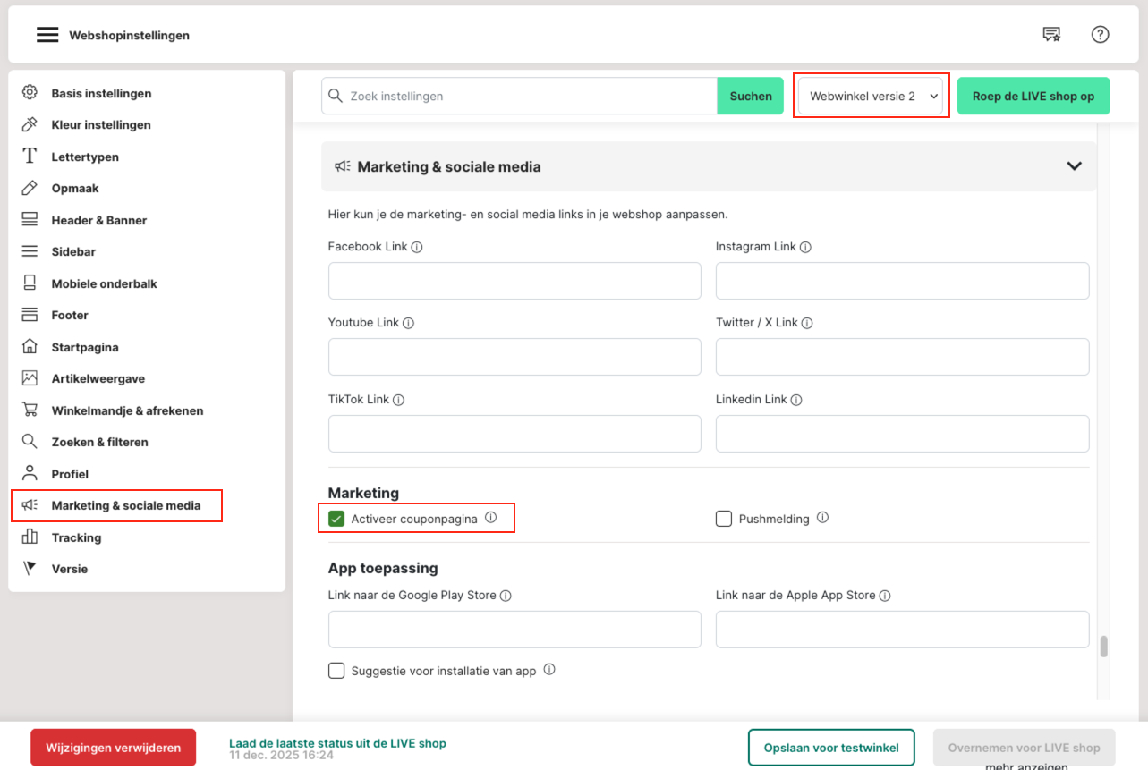 - Ga naar de sectie "Marketing & sociale media" en activeer de optie "Activeer couponpagina".