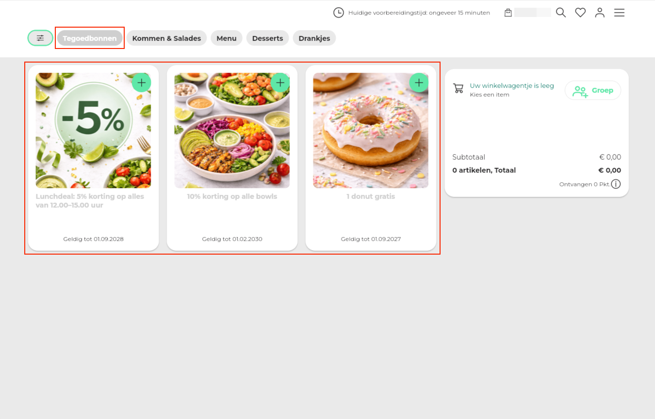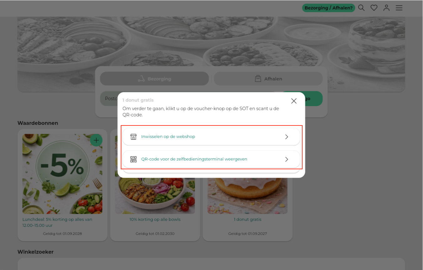 Indien nodig kan een aparte waardebonnenpagina worden geactiveerd, waarop klanten alle waardebonnen kunnen bekijken die ook op de startpagina worden weergegeven. Zo hebben ze na het selecteren van een vestiging direct toegang tot de waardebonnen.