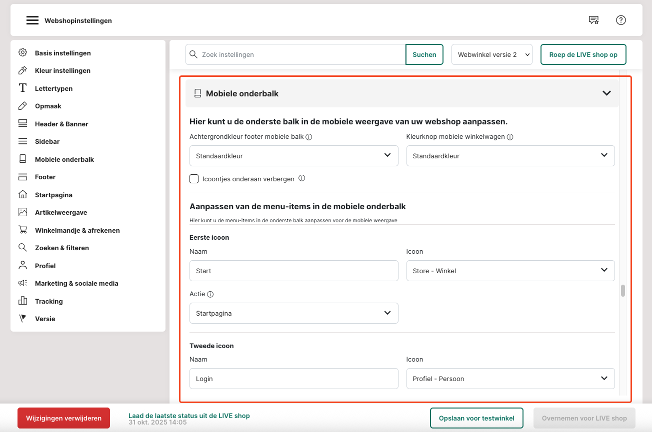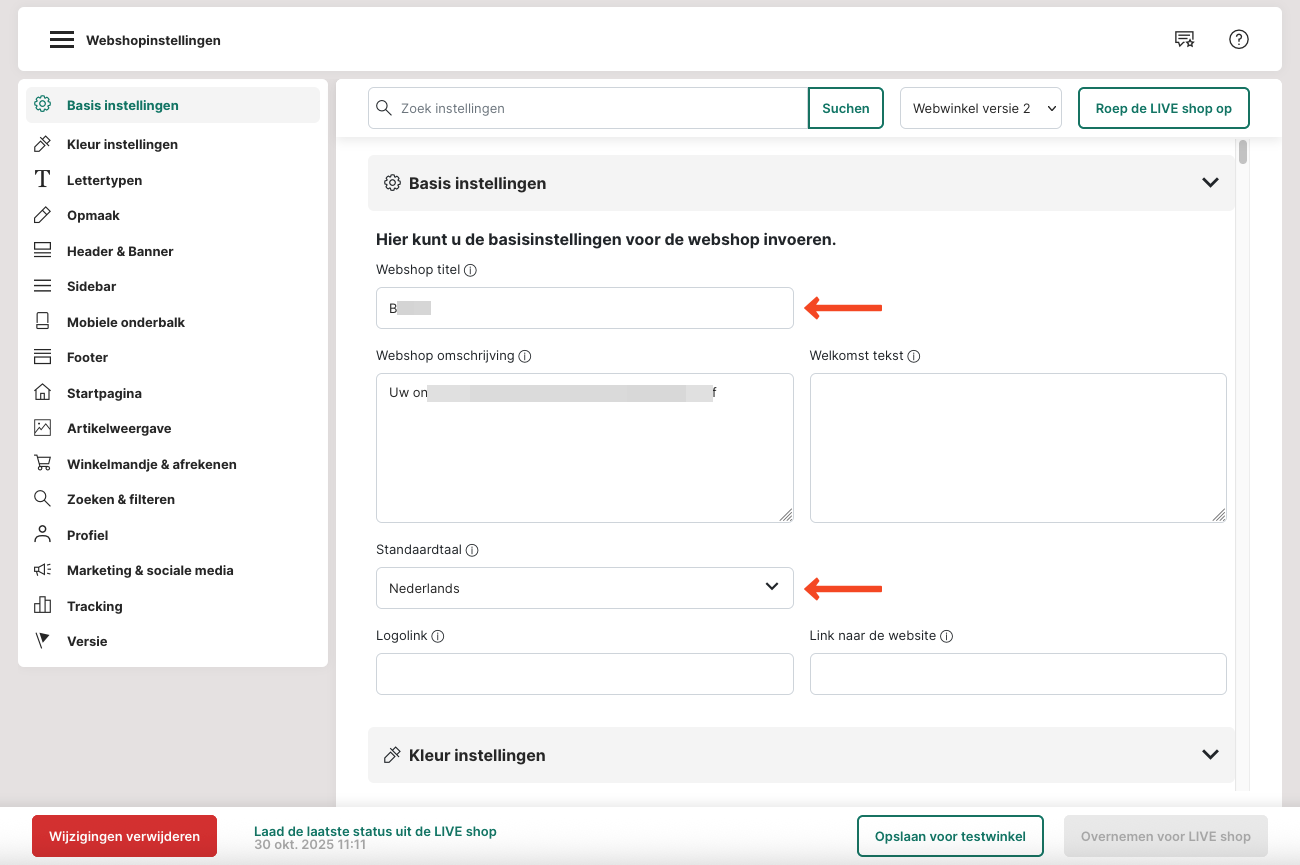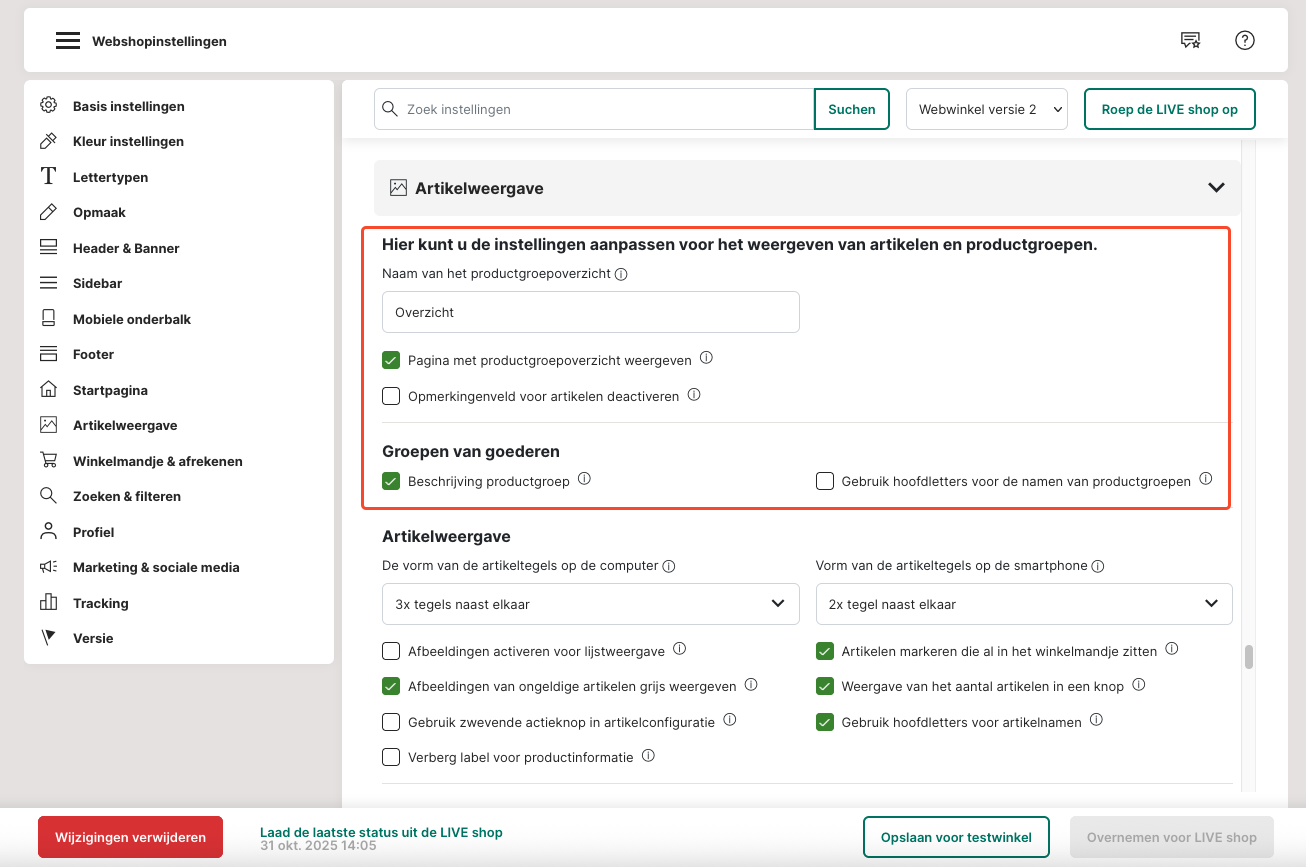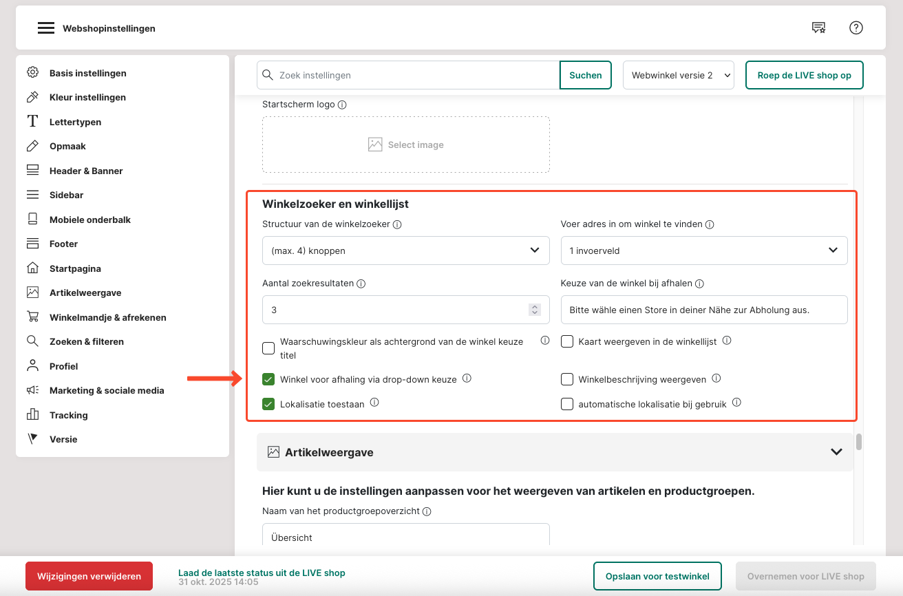 3. Wijzig de instellingen van "Webshop versie 1" naar "Webshop versie 2".