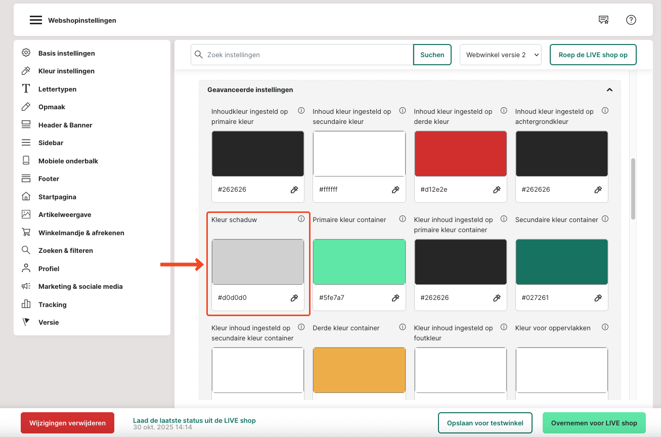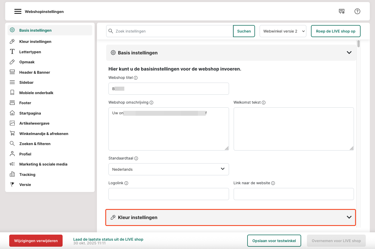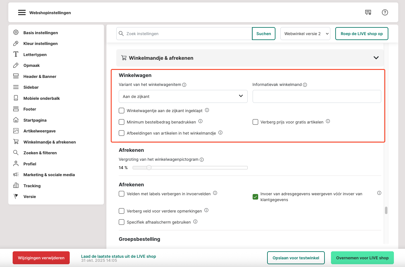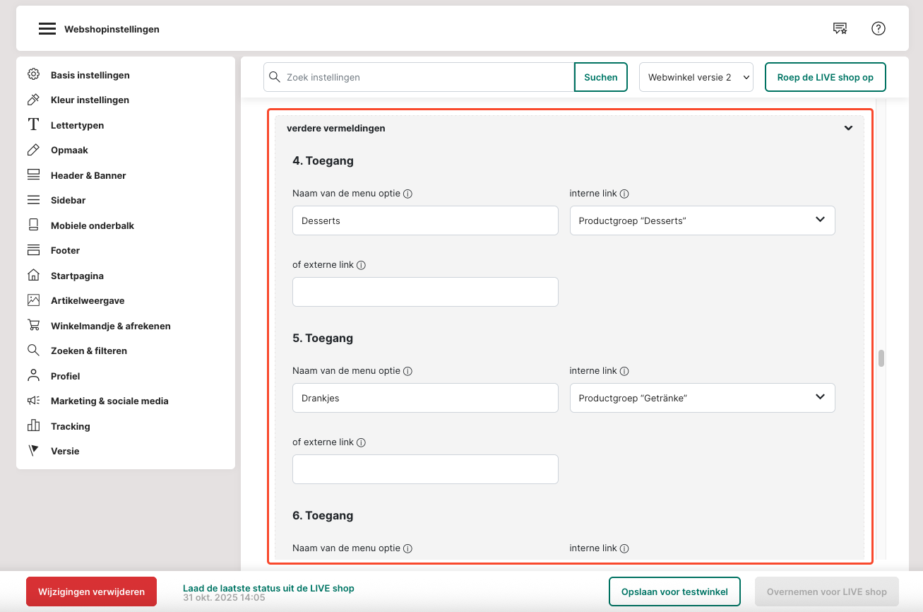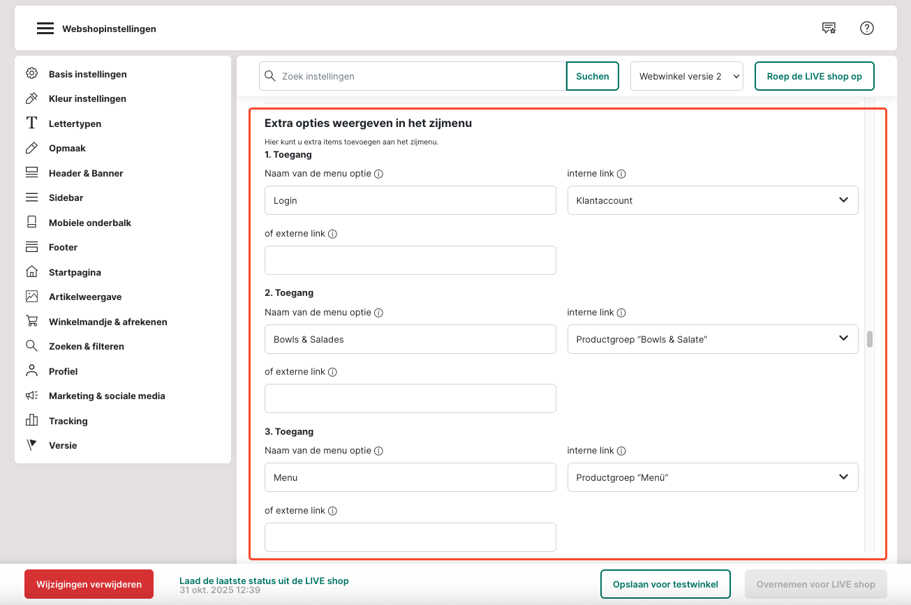 3. Wijzig de instellingen van "Webshop versie 1" naar "Webshop versie 2".
