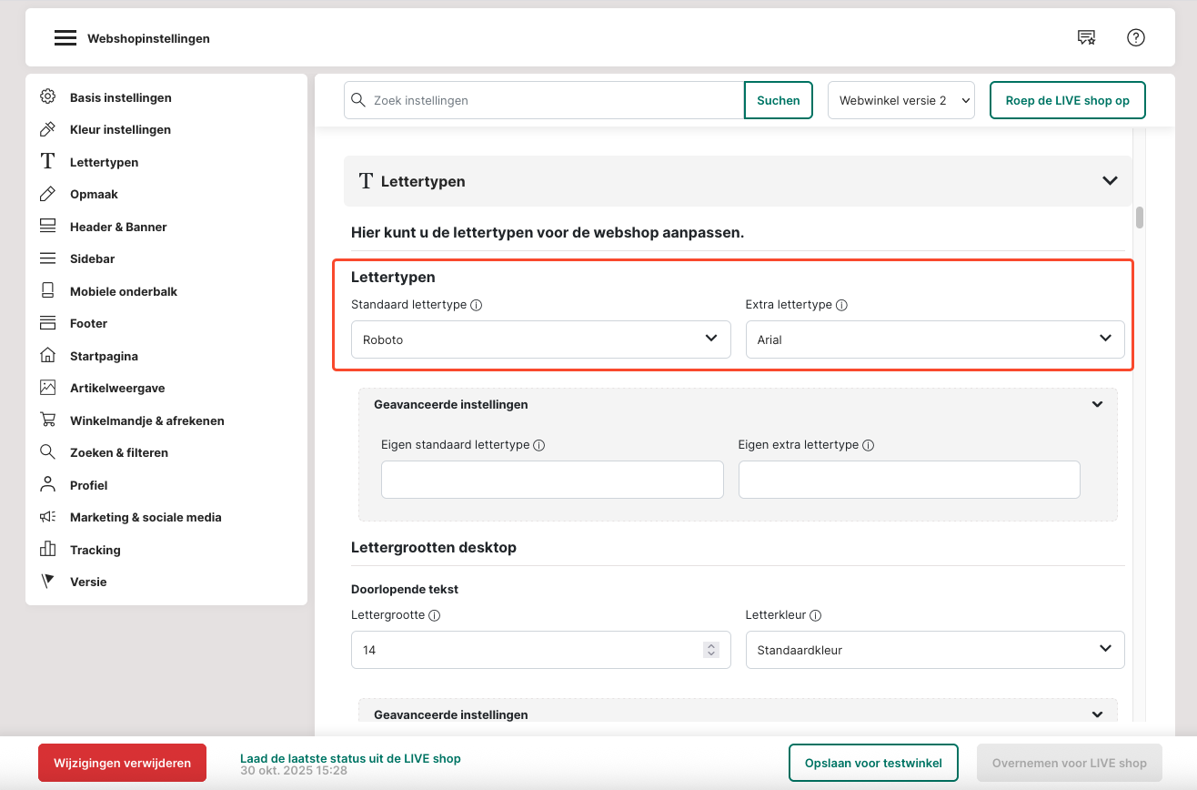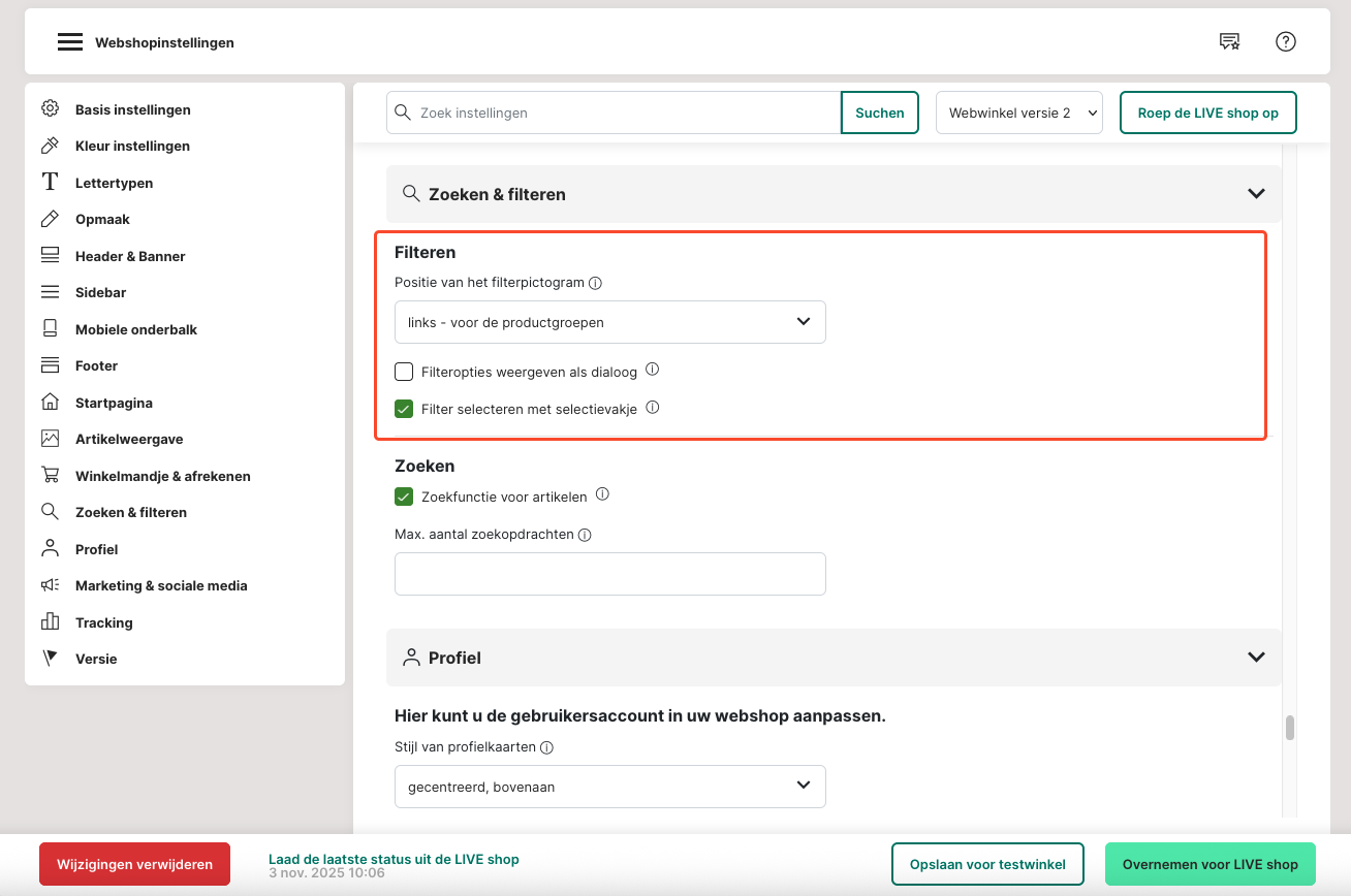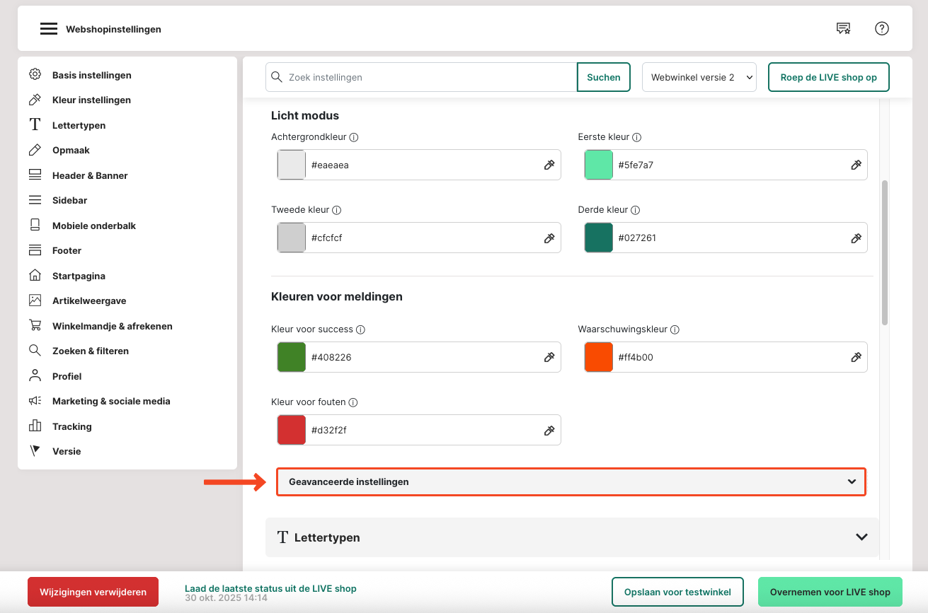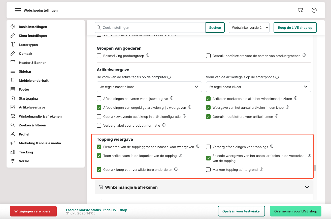3. Wijzig de instellingen van "Webshop versie 1" naar "Webshop versie 2".