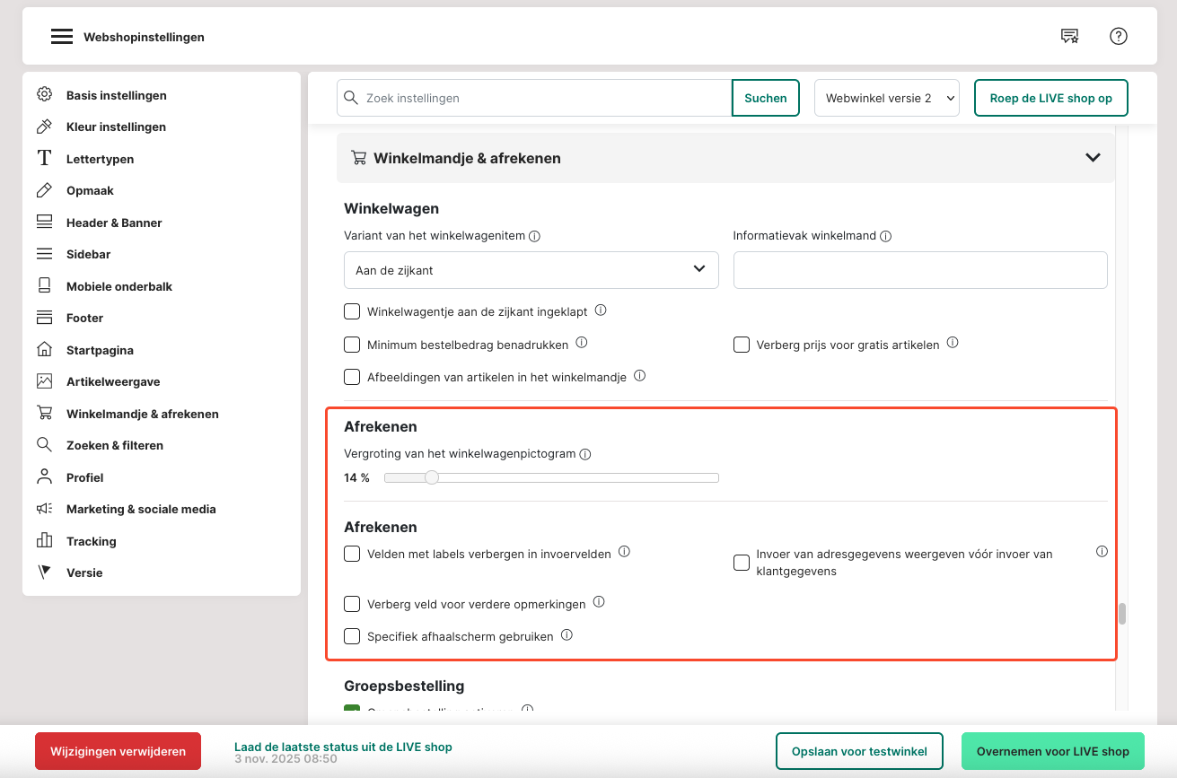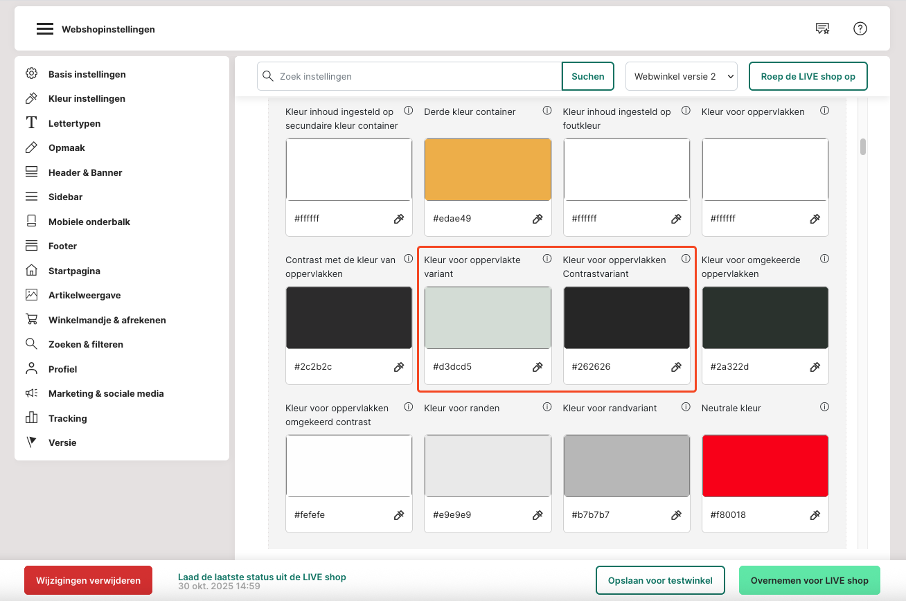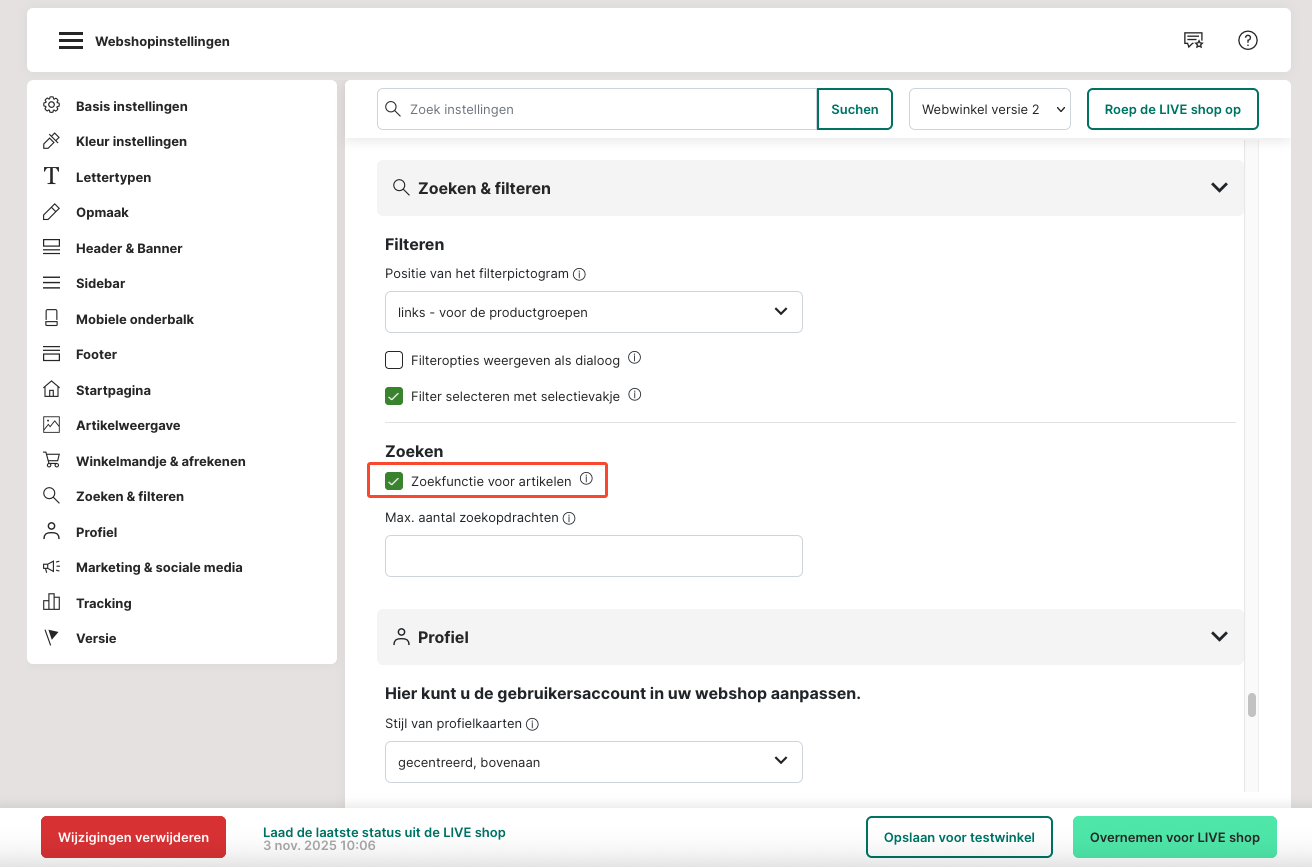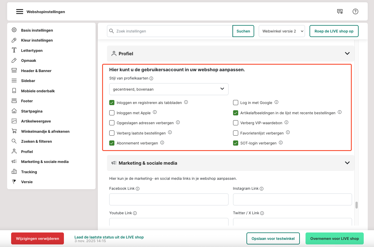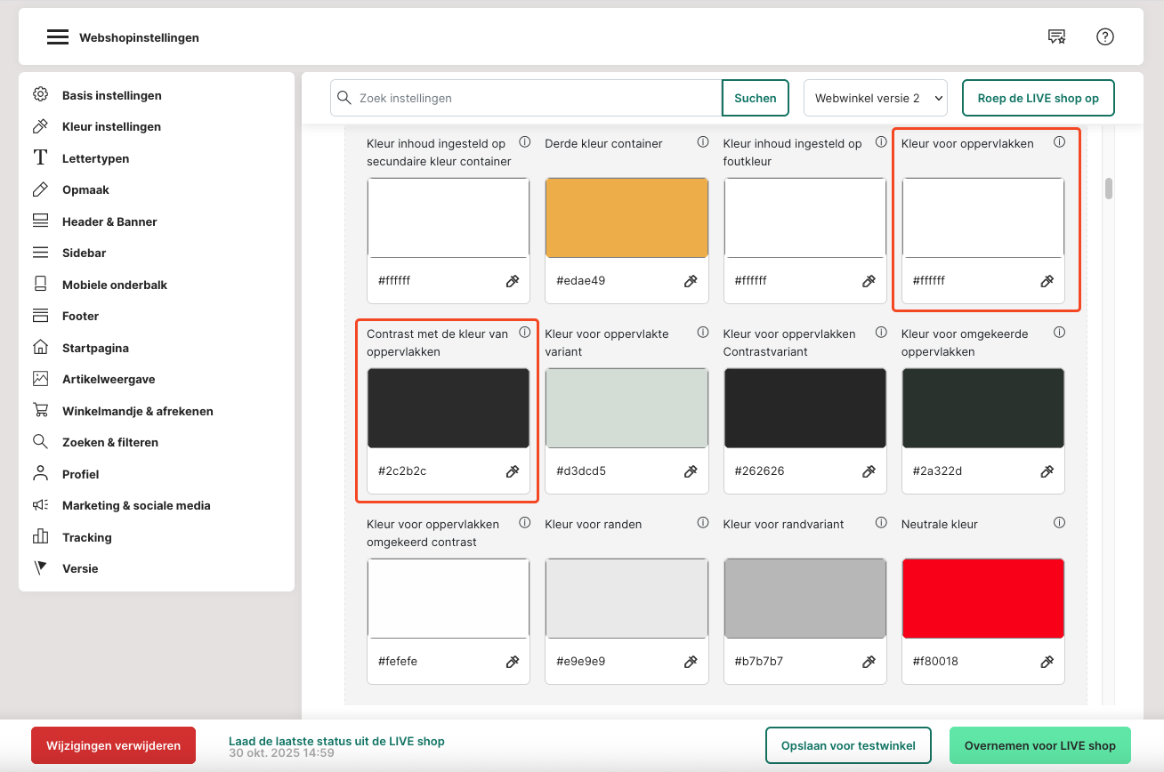 3. Wijzig de instellingen van "Webshop versie 1" naar "Webshop versie 2".