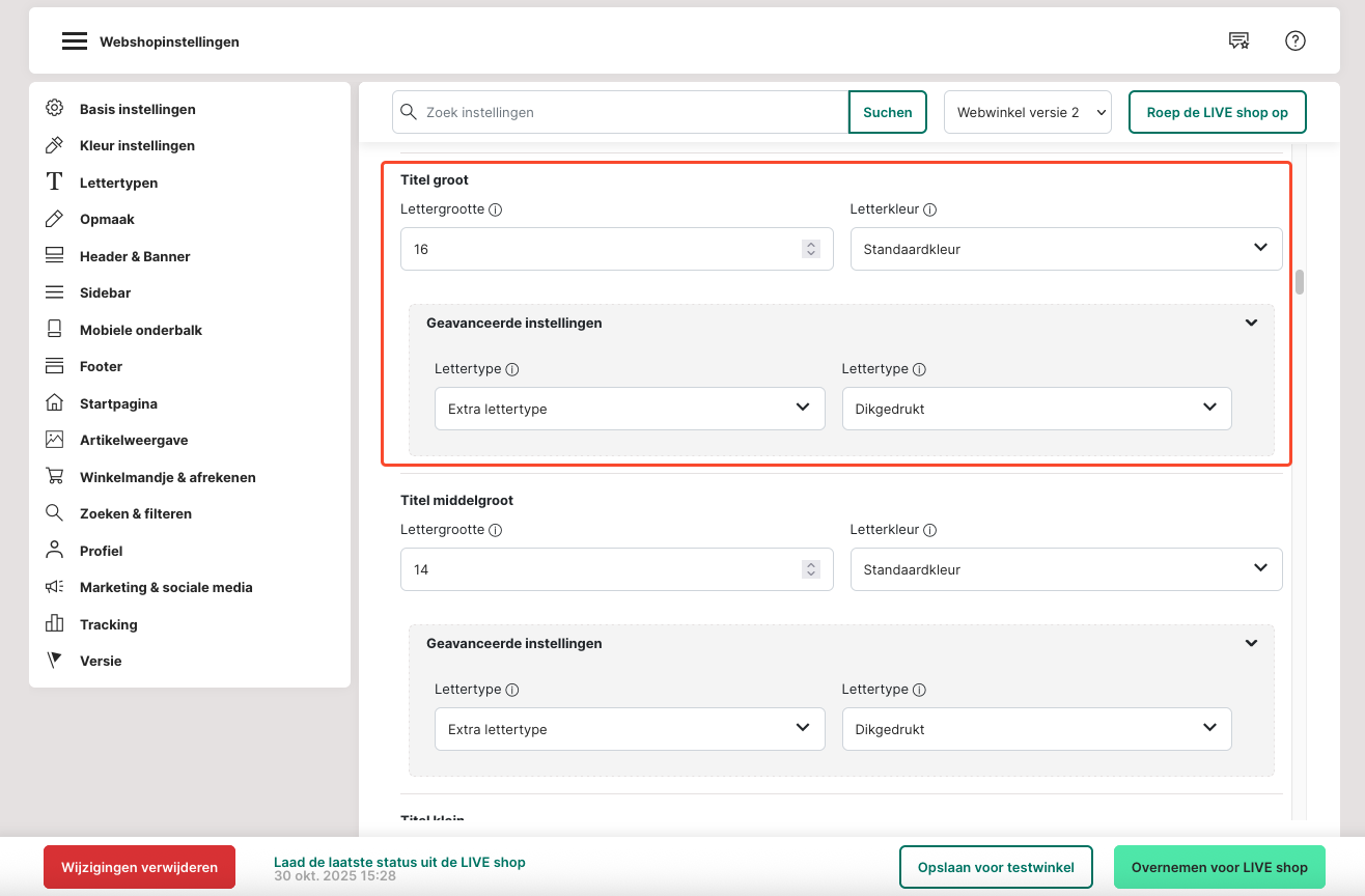 25. Voor alle "Titel"-groottes kun je kiezen of het "Standaard lettertype" of het "Extra lettertype" gebruikt moet worden, en of het "bold" of "regular" moet zijn.