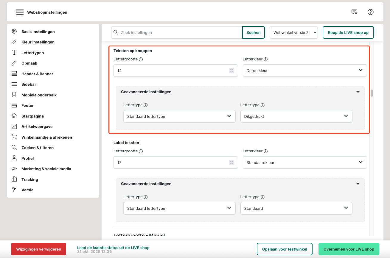 27. Voor de "Knoppen" kun je ook het "Lettergrootte", "Lettertype" en "Kleur" selecteren.