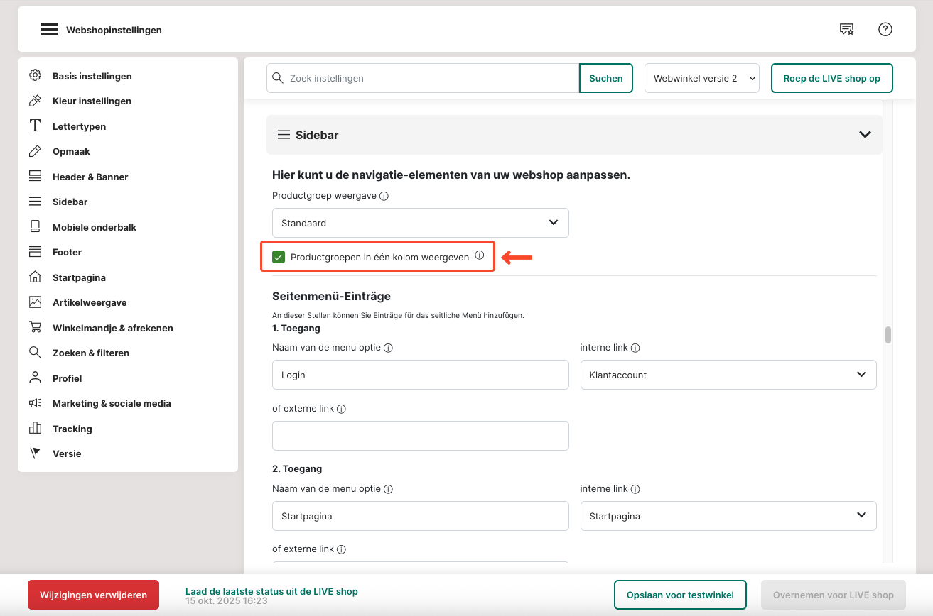 32. Om de productgroepen onder elkaar in het zijdemenu weer te geven, moet onder "Sidebar" het vakje "Productgroepen in één kolom weergeven" worden aangevinkt.