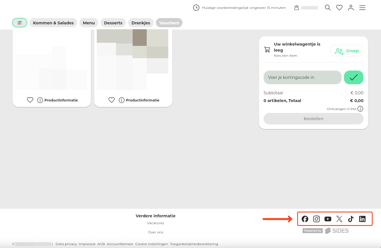 64. Om een groter bereik te behalen, kun je je socialmediapagina's in de footer (voettekst) koppelen. Vul hiervoor de URL van je pagina's in het betreffende veld in.