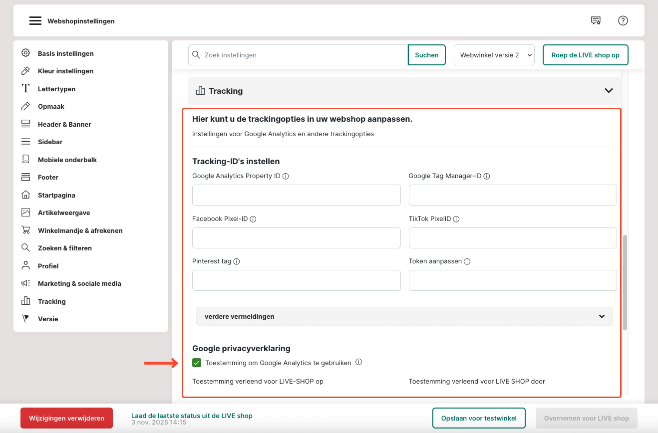 67. Om het gebruik van de webshop te volgen, kun je hier de verschillende tag-ID's invoeren. Houd er rekening mee dat je voor het gebruik van Google-tags het vinkje voor toestemming voor het gebruik van Google Analytics activeert.