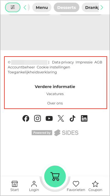 39. Hier kunnen in de voettekst (Footer/onderste gedeelte) koppelingen naar de algemene voorwaarden, privacybeleid, etc. worden toegevoegd. Dit geldt voor zowel de browser- als de mobiele webshop.
