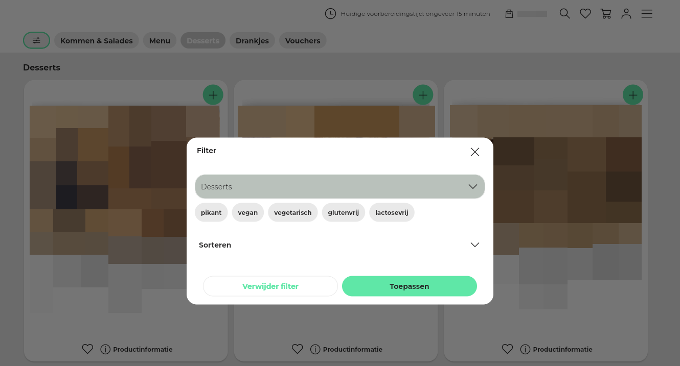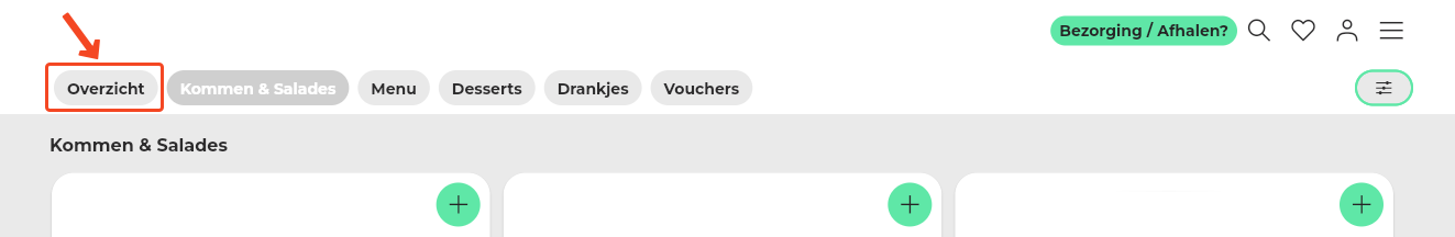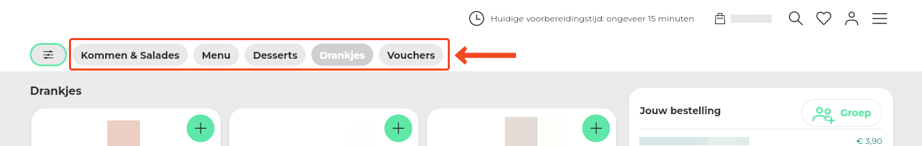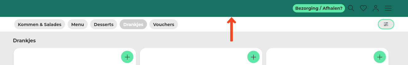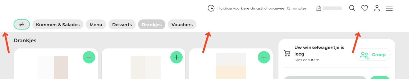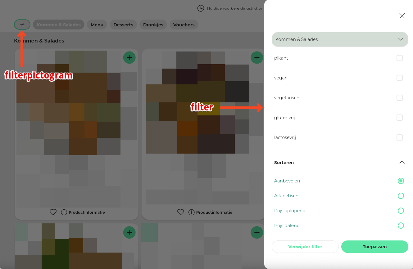 58. Als je artikelen hebt voorzien van artikeltags (artikelfilter), hebben klanten via de "Filteren" de mogelijkheid bijvoorbeeld alleen vegetarische artikelen te laten weergeven (als de artikelinstellingen correct zijn). De filterfunctie kan ook worden verborgen. Stel hiervoor de positie van het filter-icoon (filtersymbool) in het dropdownmenu in op "Filtericoon verbergen".
