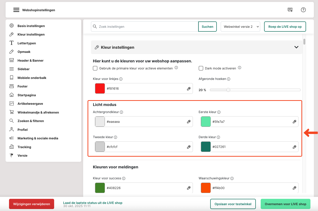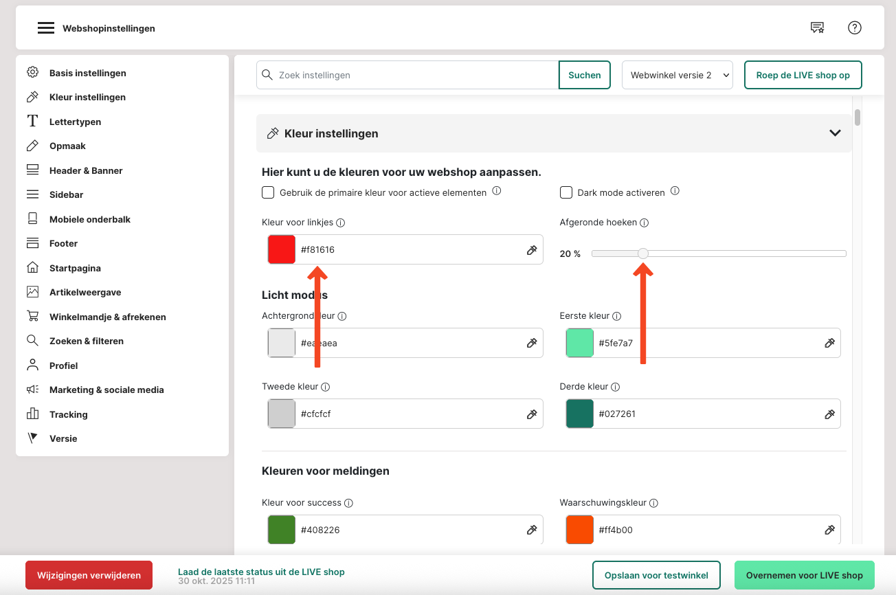 9. Onder "Kleur voor linkjes" kun je een kleur naar keuze instellen voor de koppelingen in je webshop.