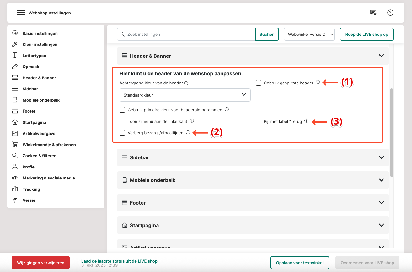 30. Onder "Header & Banner" wordt de koptekst (Header) aangepast. Je header kan met "gesplitste koptekst" in twee verschillende kleuren worden weergegeven (1), je kunt de "Bezorg- en afhaaltijden verbergen" (2) en ook hier de "Terug-pijl" activeren zodat deze wordt weergegeven (3).