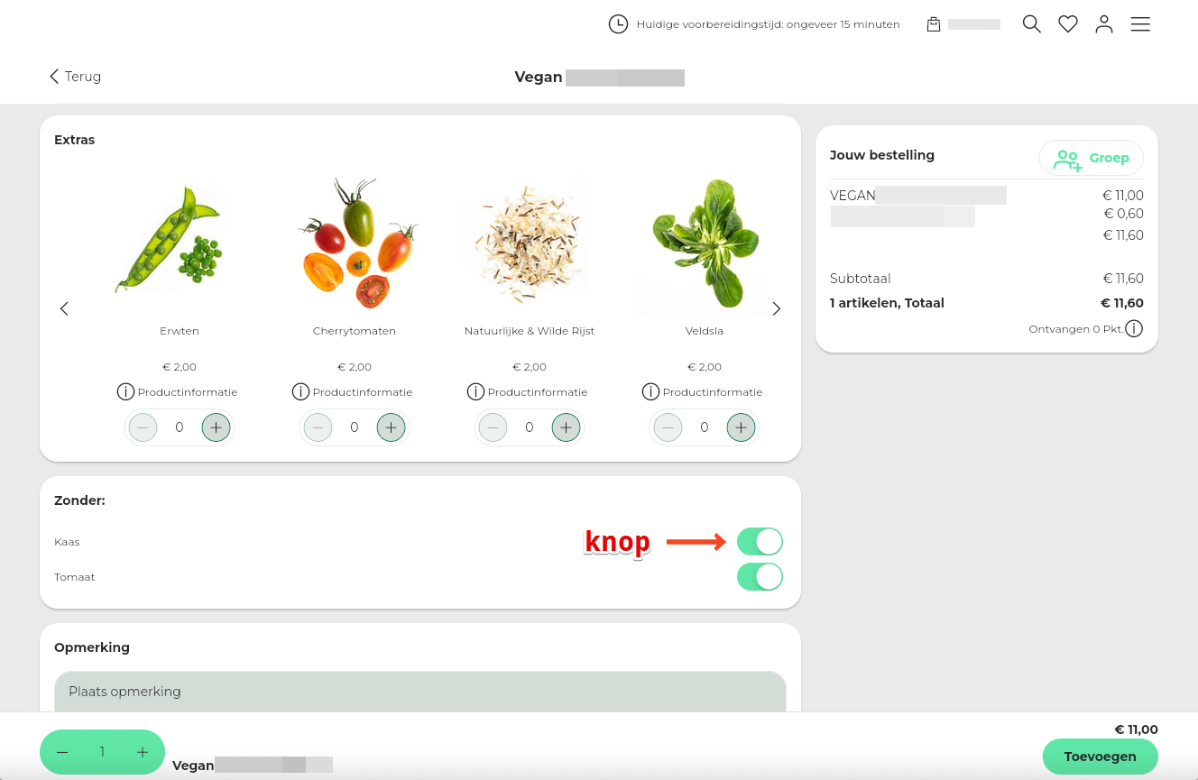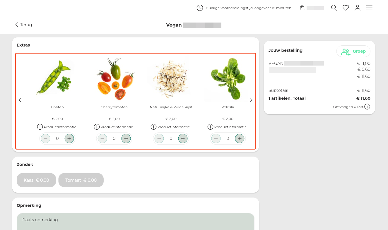 53. Voorbeeld topping weergave: toon artikelnaam in de koptekst van de topping + gebruik knop voor verwijderbare onderdelen + selectie weergeven van het aantal artikelen in de voettekst van de topping.