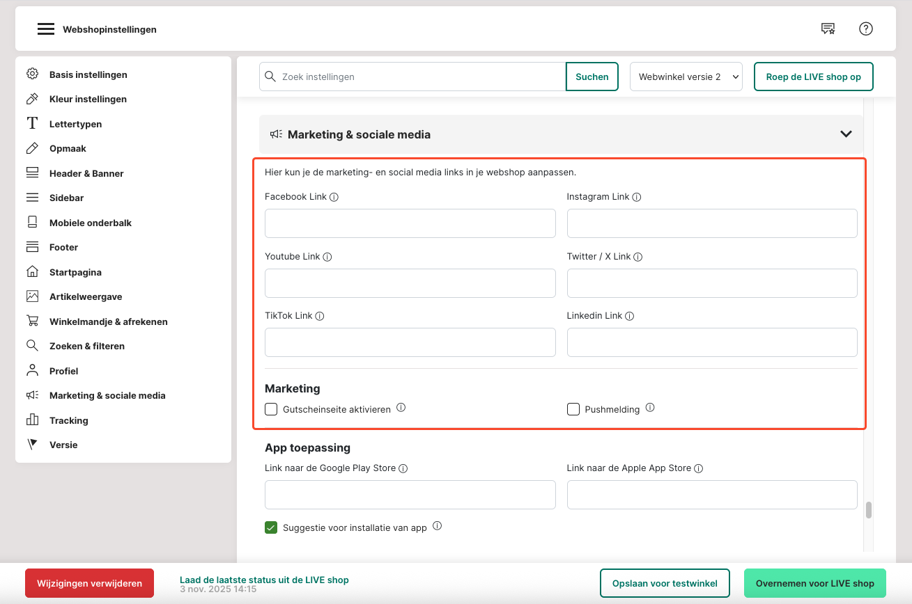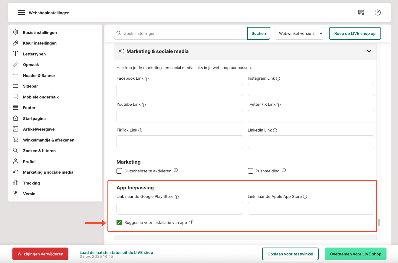 Wil je dat de installatie van de app wordt voorgesteld zodra iemand je webshop bezoekt, vink dan het vakje "Suggestie voor installatie van app" aan.
