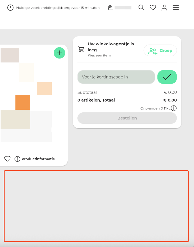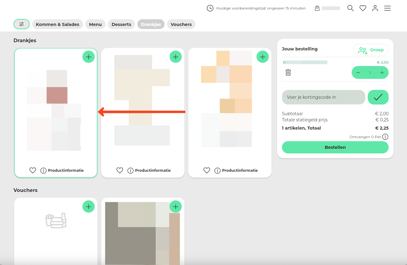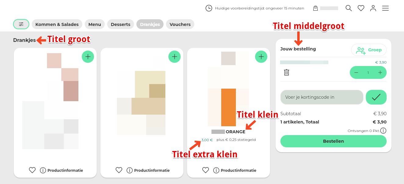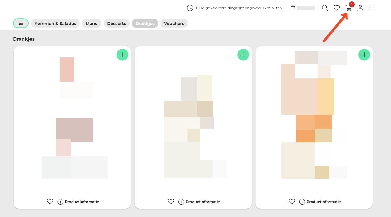 50. Voorbeeld artikelweergave: 1 grote, 2 kleine tegels + artikelen markeren die al in het winkelmandje zitten.