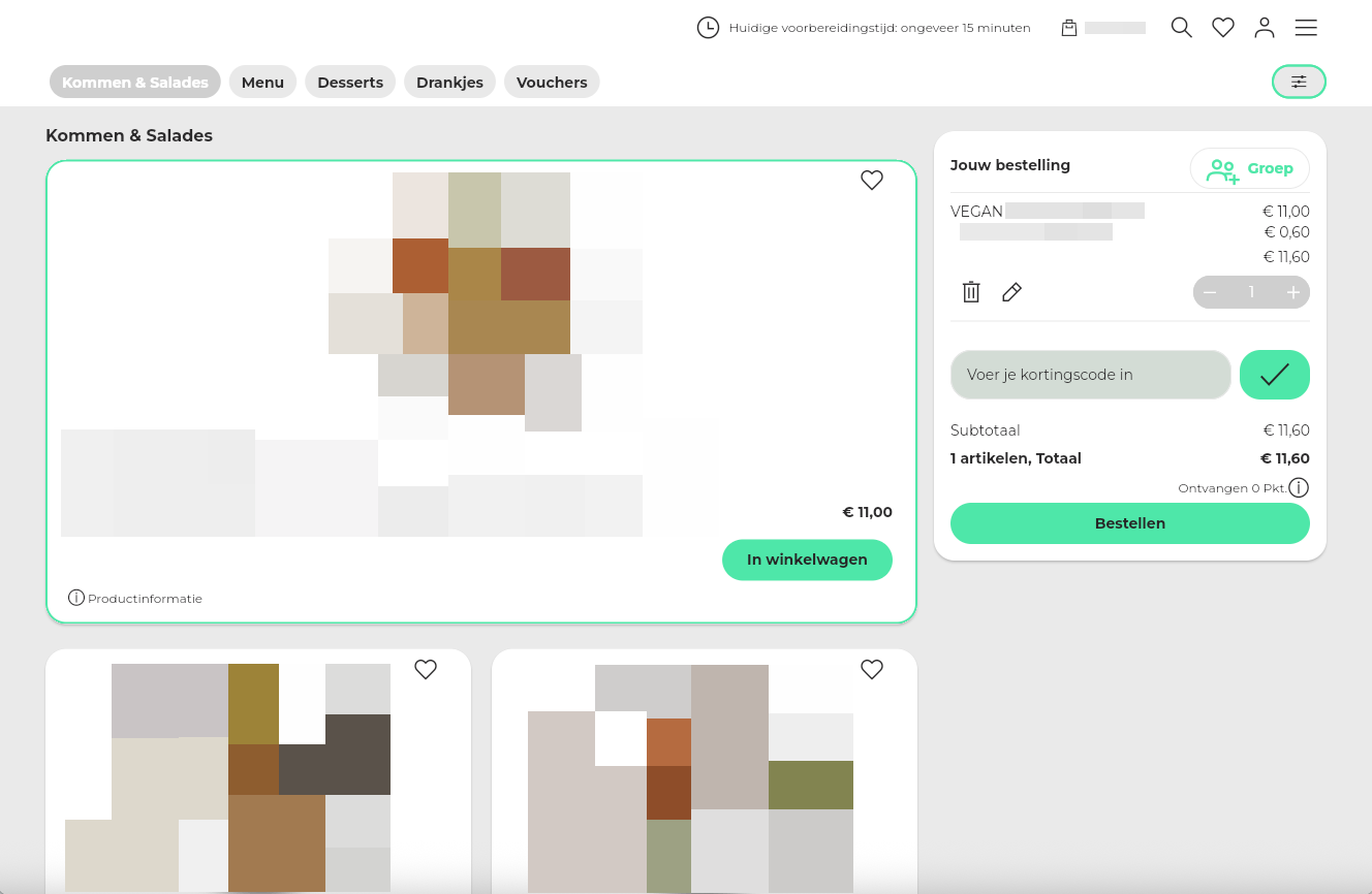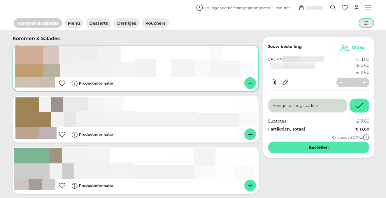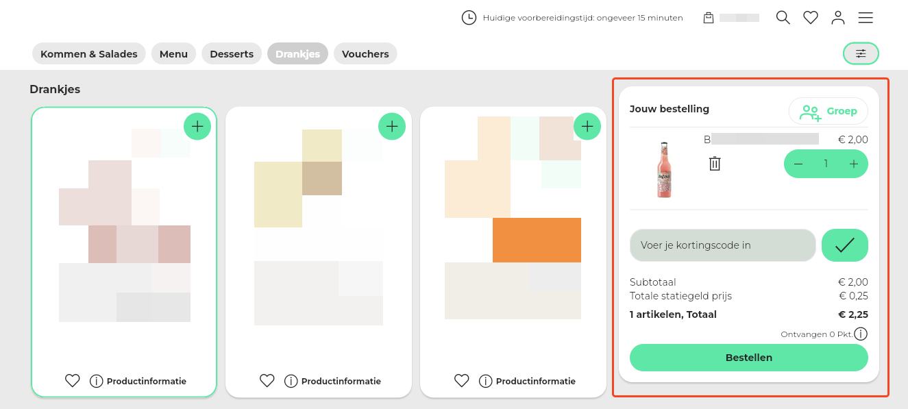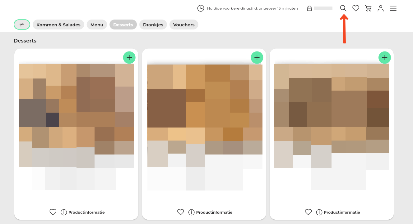 50. Voorbeeld artikelweergave: 1 grote, 2 kleine tegels + artikelen markeren die al in het winkelmandje zitten.