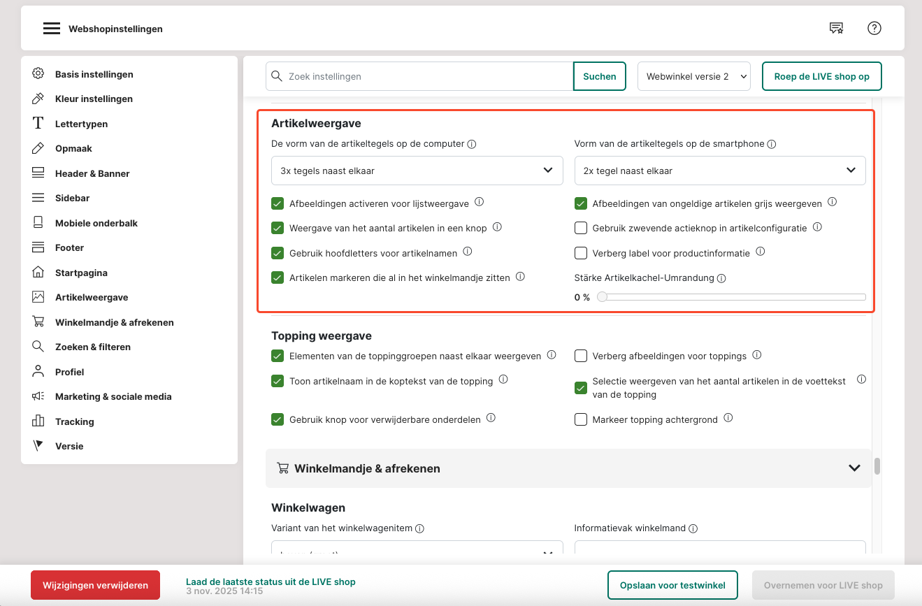 Afbeeldingen kunnen ook in de lijstweergave worden weergegeven als het vakje daarvoor is aangevinkt. Om artikelen die al in het winkelmandje zitten of uitverkochte artikelen te markeren, activeer je hiervoor de juiste knoppen.
