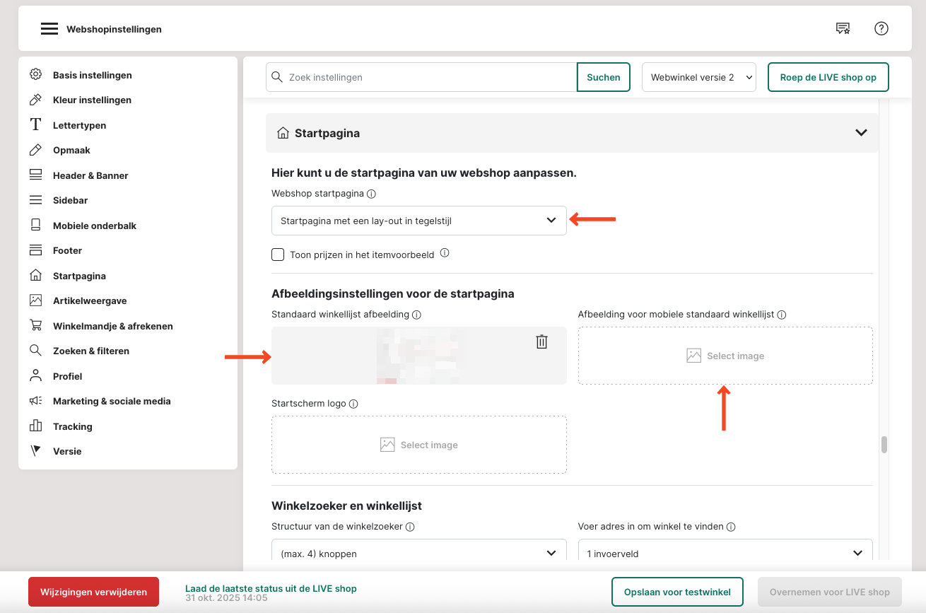 41. Onder het punt "Startpagina" kun je afbeeldingen toevoegen die op de startpagina worden weergegeven. Houd er rekening mee dat voor de mobiele webshop een ander formaat nodig is.