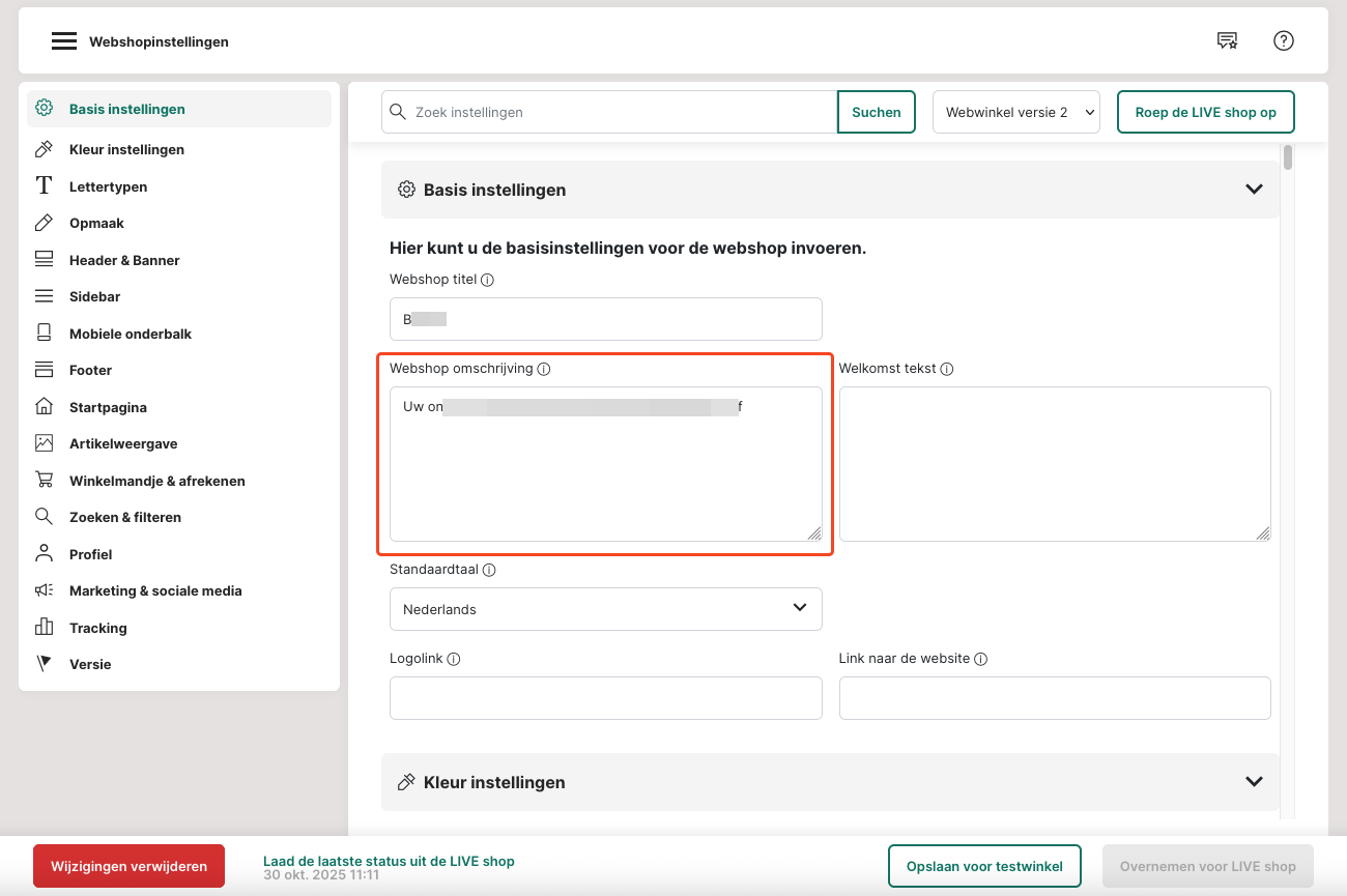 6. In het veld "Webshop omschrijving" kun je een beschrijving voor je webshop invoeren. Deze wordt ook door verschillende zoekmachines gebruikt om je webshop aan te bevelen.