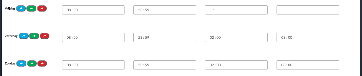 Als u bijvoorbeeld in het weekend op zowel zaterdag als zondag tot 2.00 uur 's nachts geopend bent, moet u de openingstijden als volgt vermelden.