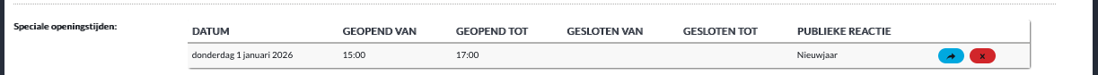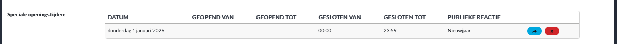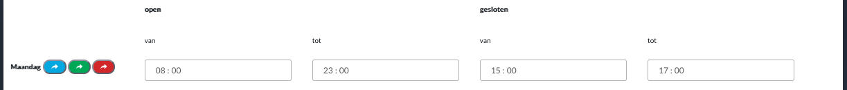 Bent u alleen op een feestdag of vrije dag gedurende een bepaalde periode geopend, dan moet de dag iets anders worden ingedeeld. Bent u bijvoorbeeld alleen geopend van 15.00 tot 17.00 uur, dan moet de sluitingsdag als volgt worden gedefinieerd:
