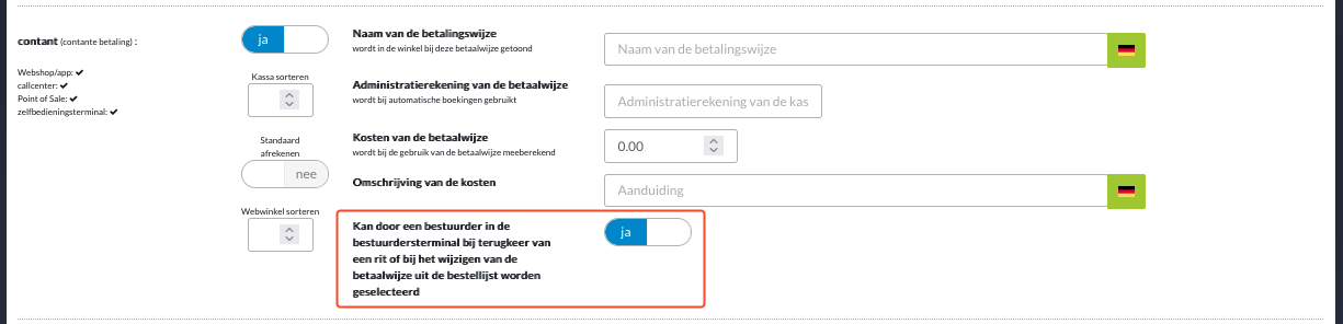 Bovendien kunt u voor bijna elke betaalmethode kiezen of uw chauffeurs de betaalmethode in de terminal en in het orderoverzicht kunnen wijzigen.