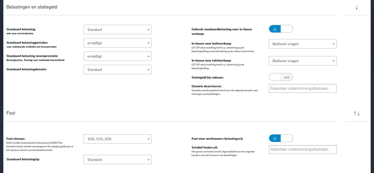 Fooienniveaus: Bepaalt welke automatische fooienniveaus moeten worden weergegeven op SIDES Pay-betaalterminals. De wijziging wordt pas toegepast nadat de betaalterminals opnieuw zijn opgestart.