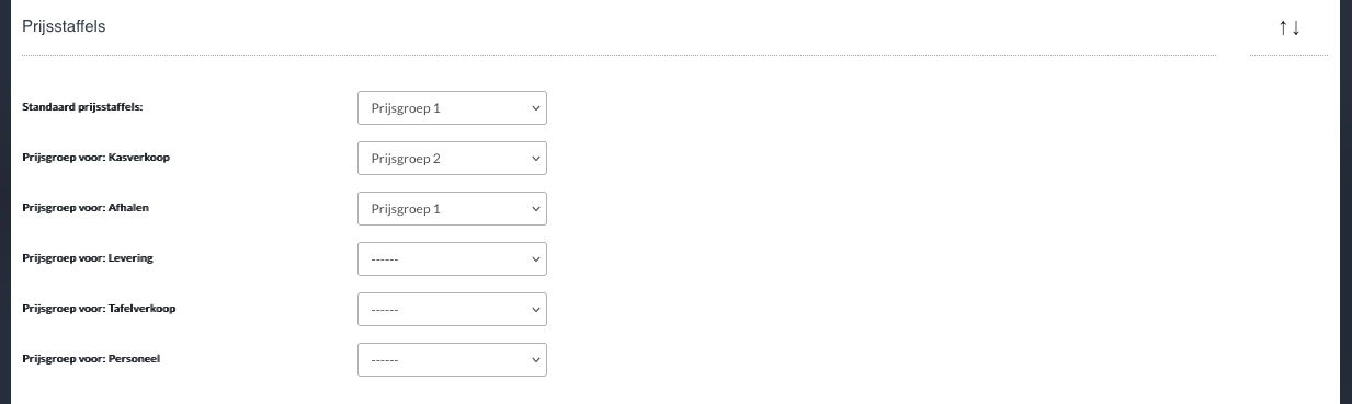 Hier kun je je vooraf aangemaakte prijsniveaus selecteren. Als je bijvoorbeeld andere prijzen hanteert voor verkoop aan de balie dan voor levering, kun je hier een ander prijsniveau selecteren. Voor het geselecteerde prijsniveau moet dan voor elk artikel een overeenkomstige prijs worden opgegeven. Als er geen prijs wordt opgegeven, gebruikt het systeem automatisch de standaardprijs die bij het artikel is opgegeven.