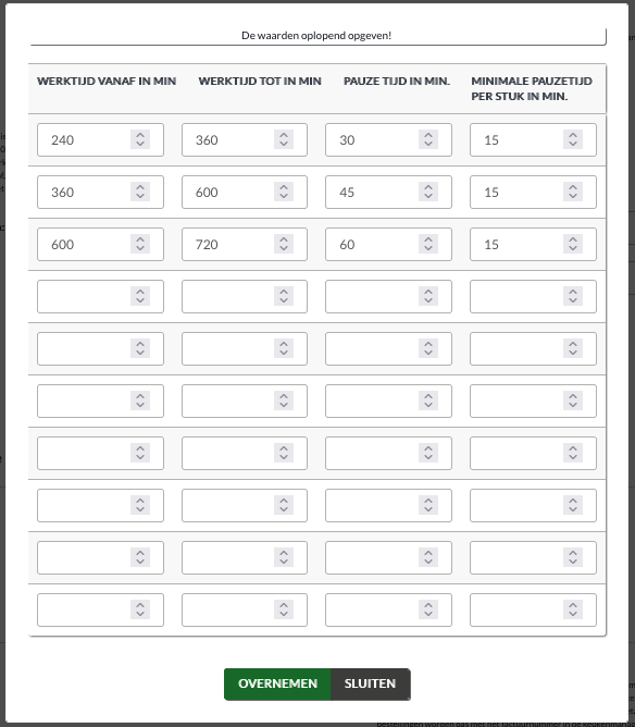 Automatisch pauzetijden invoeren: als er geen pauzes handmatig zijn ingevoerd, worden er na afloop van de dienst automatisch pauzes toegewezen aan medewerkers. Handmatige pauzetijden kun je toevoegen via de knop "Pauzetijden bewerken".