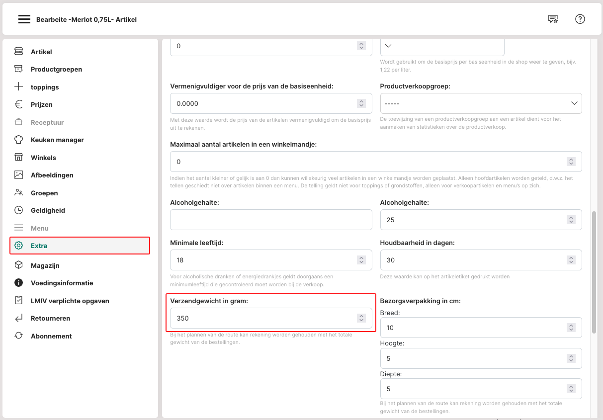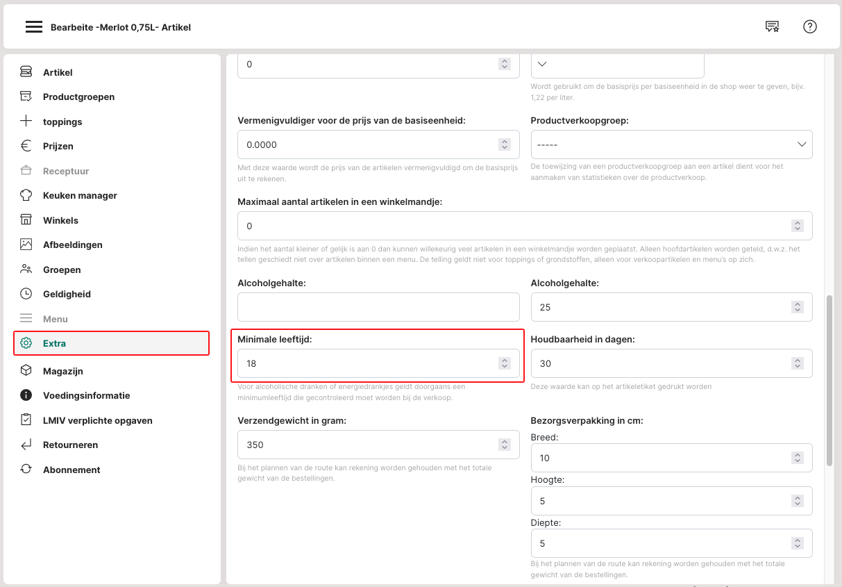 - Wolt Koerier krijgt automatisch een melding om de ID van de klant te controleren als de bestelling producten met alcohol bevat. Om dit te doen, moet bij alle producten die een leeftijdscontrole vereisen het veld leeftijdsgrens worden ingevuld: Admin: Artikelen beheren > Arikel > zoek het item dat je wilt voorzien van een leeftijdsgrens > druk op "Bewerken" (het potloodlogo) > Extra > Minimale leeftijd.